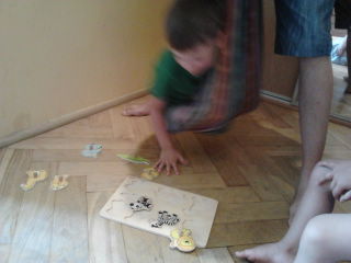 potrzebna huśtawka nisko zawieszona, lub lepiej chusta i jakaś układanka lub puzzle - mówimy dziecku co ma podnieść, ono wyszukuje wzrokiem i układa w odpowiednie miejsce, a przy tym przez cały czas jest bujane w chuście lub huśtawce - zobaczcie: