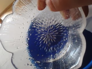 następnego dnia rano wykorzystaliśmy nasz ocean z butelce do innego celu - odlaliśmy nieco wody z atramentem, dolaliśmy oleju i...wrzuciliśmy tabletkę musującą!